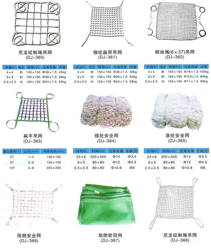 吊網有:吊貨網,尼龍吊網,鋼絲繩吊網,尼龍扁帶吊網,鋼絲吊網,鋼纜吊網,鋼纜吊貨網,鋼絲吊貨網,PP繩吊貨網,鋼絲繩吊貨網,尼龍繩吊貨網,尼龍繩吊網,吊裝用吊網、防護吊網,尼龍扁平吊網,扁帶吊網,錦綸帶吊網,錦綸帶吊貨網,繩索吊網,貨柜網,貨物網,碼頭吊貨網,尼龍吊貨網,編織帶吊網,港口吊網,休閑吊床(吊網),編織繩網,特種吊網,化纖吊網,尼龍吊裝網,起重吊裝網,聚乙烯(尼龍)絞制繩吊網,尼龍絞制繩吊網,錦綸安全網,錦綸扁帶吊網,尼龍扁帶吊網。